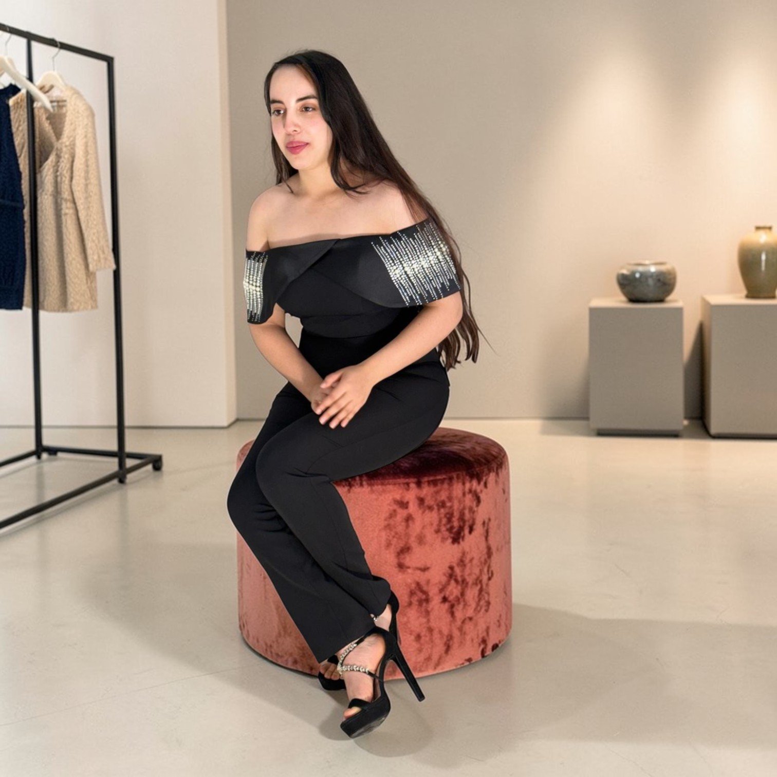 Découvrez notre combinaison pantalon de soirée pour femme, une pièce chic et intemporelle conçue pour marquer les esprits. Ce modèle noir se caractérise par une encolure à épaules dénudées (off-the-shoulder) sublimée par des motifs de cristaux scintillants apportant une touche de lumière luxueuse. Sa coupe cintrée et son pantalon droit assurent une allure élancée et élégante. Parfaite pour vos événements formels, cette « combi-pantalon » allie confort et haute couture pour un look glamour irrésistible.