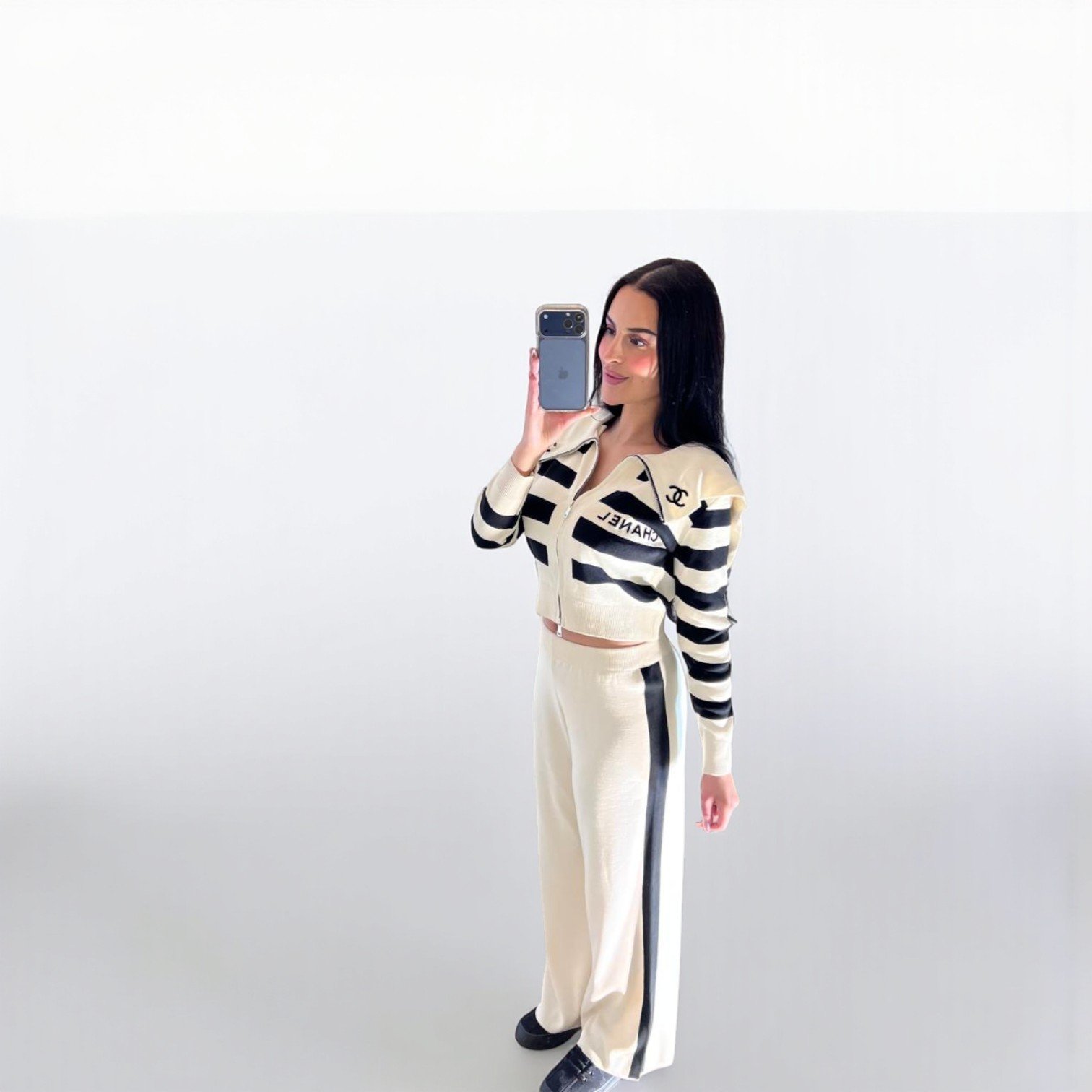 Adoptez un look iconique et décontracté avec cet ensemble deux-pièces au contraste graphique noir et blanc. Ce set se distingue par son gilet zippé à coupe courte (crop), orné de rayures horizontales d’inspiration marine et d’un col polo élégant qui structure la silhouette. Le pantalon fluide à taille haute, d’un blanc crème immaculé, est rehaussé d’une bande latérale noire contrastante qui élance la jambe. Conçu dans une maille douce et stretch, cet ensemble offre une liberté de mouvement totale tout en affichant un luxe discret. Idéal pour voyager avec style ou pour vos journées de détente citadines.