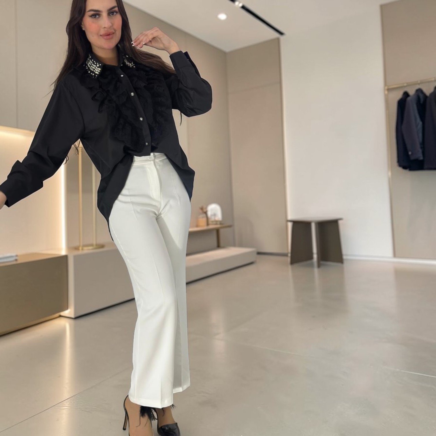 Adoptez un look glamour et raffiné avec cet ensemble bicolore pour femme. Composé d’une chemise noire ornée de détails perlés et d’un pantalon blanc fluide, cette tenue allie confort et élégance haute couture. Parfait pour une soirée ou une cérémonie, ce combo chic est un indispensable du vestiaire féminin moderne. Commandez votre tenue de soirée dès maintenant pour un style impeccable.