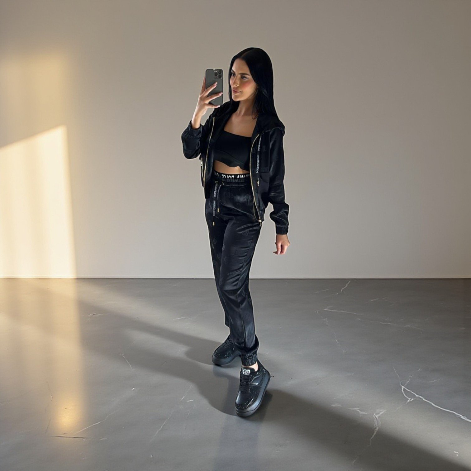 Affirmez votre style avec cet ensemble de survêtement noir au fini satiné ultra-luxueux. Conçu pour la femme moderne, cet ensemble trois-pièces (ou deux-pièces selon votre choix) se compose d’une veste zippée à capuche et d’un pantalon jogger ajusté. Les détails raffinés, tels que les bandes logotées à la taille et le long de la fermeture, ajoutent une touche couture irrésistible. Sa matière fluide capture délicatement la lumière, offrant un look sophistiqué idéal aussi bien pour vos voyages que pour vos sorties décontractées les plus chics. Un indispensable qui marie l’esthétique sport-chic à un confort absolu.