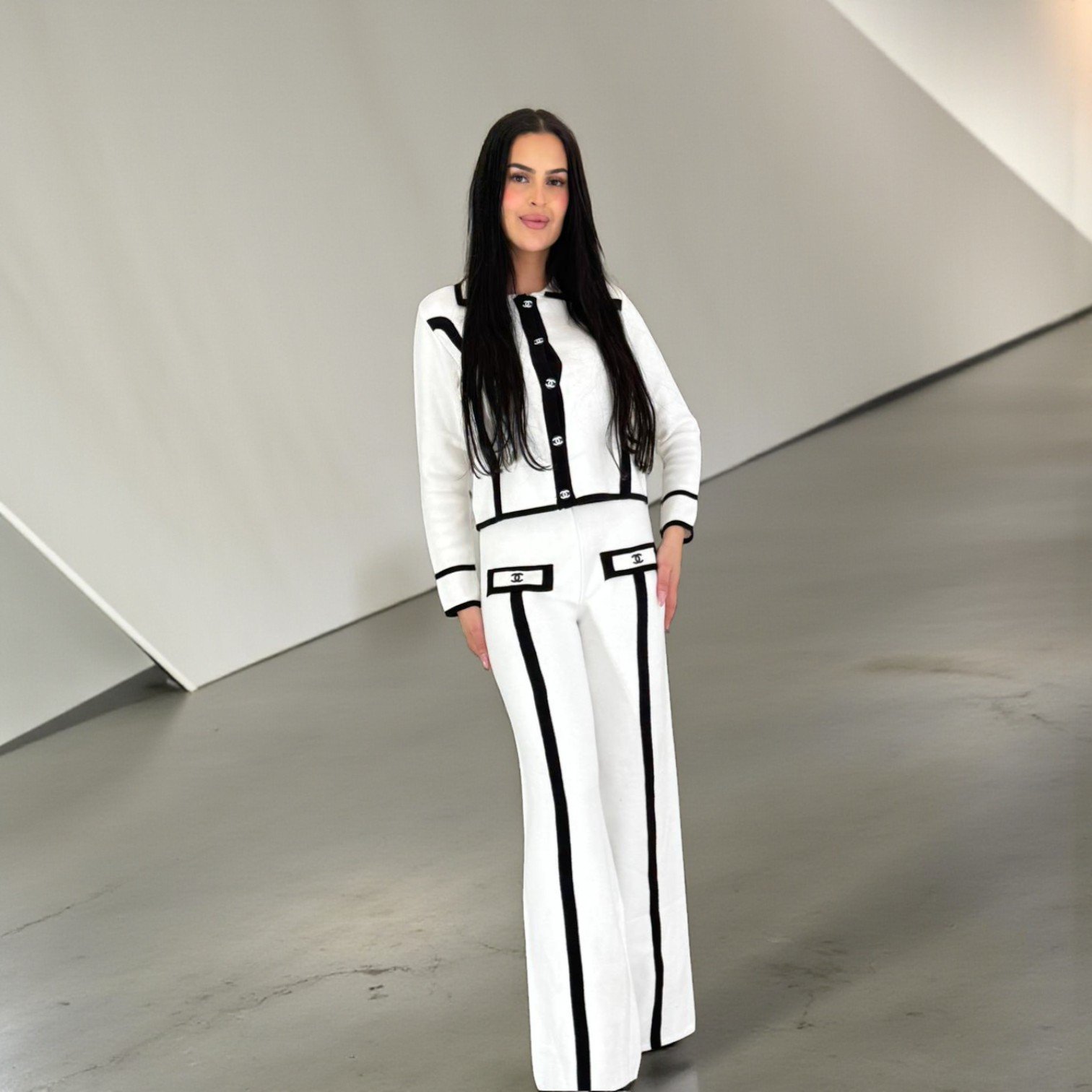 Affirmez votre élégance avec cet ensemble deux-pièces sophistiqué, véritable hommage au chic intemporel. Confectionné dans une maille structurée de haute qualité, ce set se compose d’une veste cintrée à boutonnage frontal et d’un pantalon large fluide. Le design se distingue par ses lignes graphiques contrastées noires sur fond blanc immaculé, soulignant la silhouette avec une précision géométrique. Les détails soignés, tels que les liserés marqués aux poignets et les poches décoratives hautes, apportent une touche de modernité à ce look classique. Idéal pour une allure « power dressing » au bureau ou pour un événement mondain, cet ensemble conjugue parfaitement confort et haute couture.