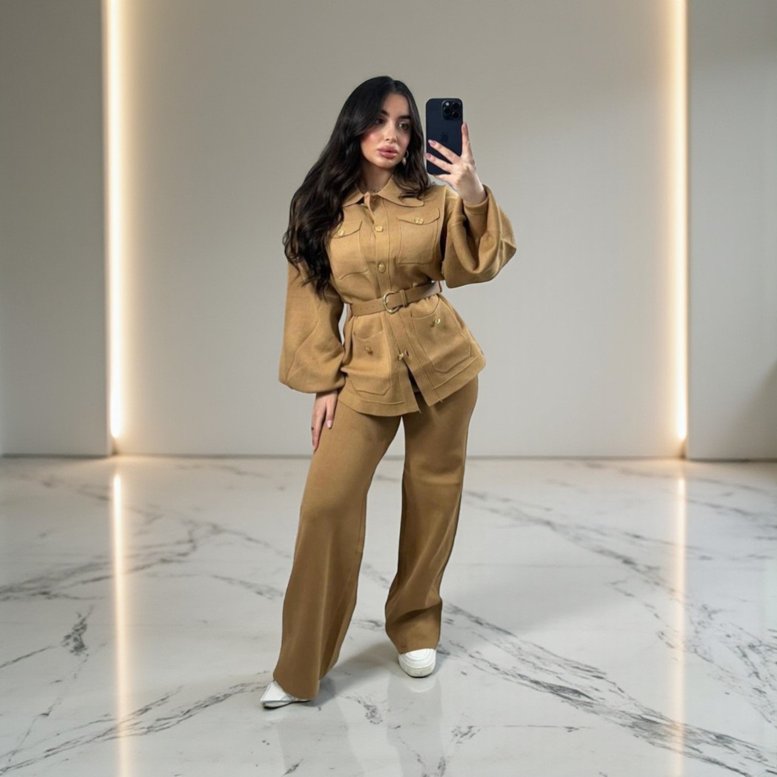 Affirmez votre allure avec cet ensemble deux pièces sophistiqué, une réinterprétation moderne du style utilitaire chic. La veste, inspirée de la coupe saharienne, se distingue par ses manches bouffantes audacieuses, ses poches à rabat élégantes et sa ceinture coordonnée qui souligne délicatement la taille pour une silhouette structurée. Elle est accompagnée d’un pantalon large et fluide qui assure un tombé impeccable et un confort absolu tout au long de la journée. Conçu dans une nuance camel intemporelle, cet ensemble est la pièce maîtresse idéale pour passer d’une réunion professionnelle à un dîner élégant avec une assurance inégalée.