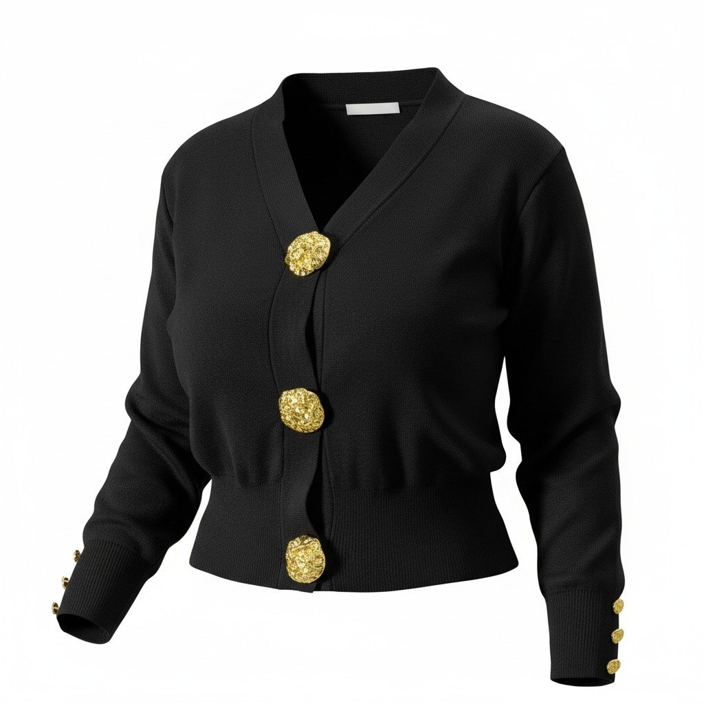 Sublimez votre allure avec ce magnifique gilet court noir, une pièce intemporelle revisitée avec une touche d’opulence moderne. Confectionné dans une maille fine et confortable, il arbore une coupe ajustée qui flatte la silhouette. Sa particularité réside dans ses trois gros boutons bijoux dorés au fini martelé et sculptural, véritable signature de cette pièce. Des boutons dorés assortis ornent également les poignets pour une finition élégante jusqu’au bout des manches.