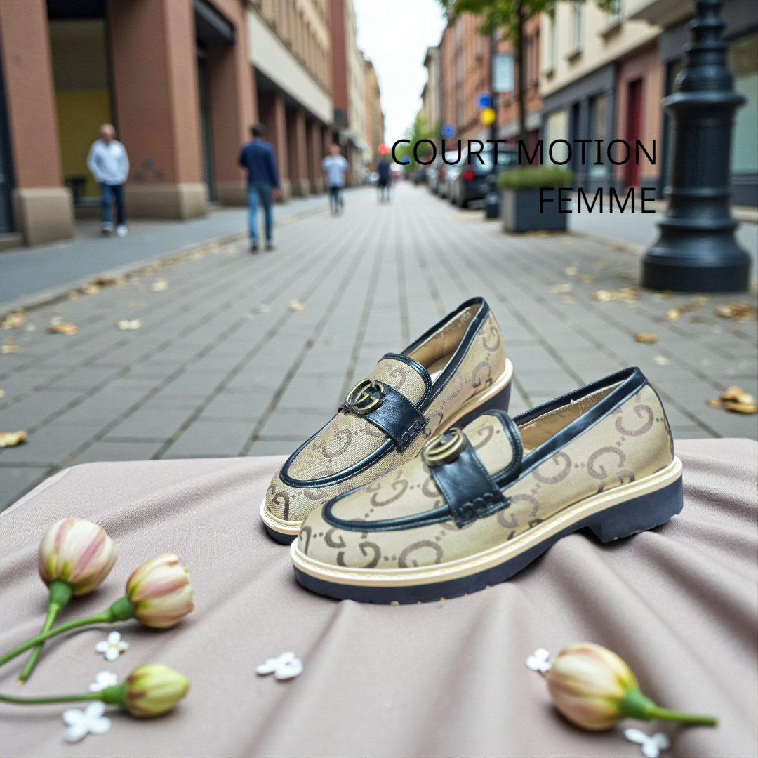 L’élégance classique rencontre le confort moderne avec ces mocassins Court Motion. Arborant un motif monogramme beige et marron iconique, ils sont rehaussés par une bride en cuir noir ornée d’une boucle dorée raffinée. La semelle crantée apporte une touche contemporaine et assure une adhérence parfaite, faisant de ce modèle le choix idéal pour un look « preppy » ou professionnel.