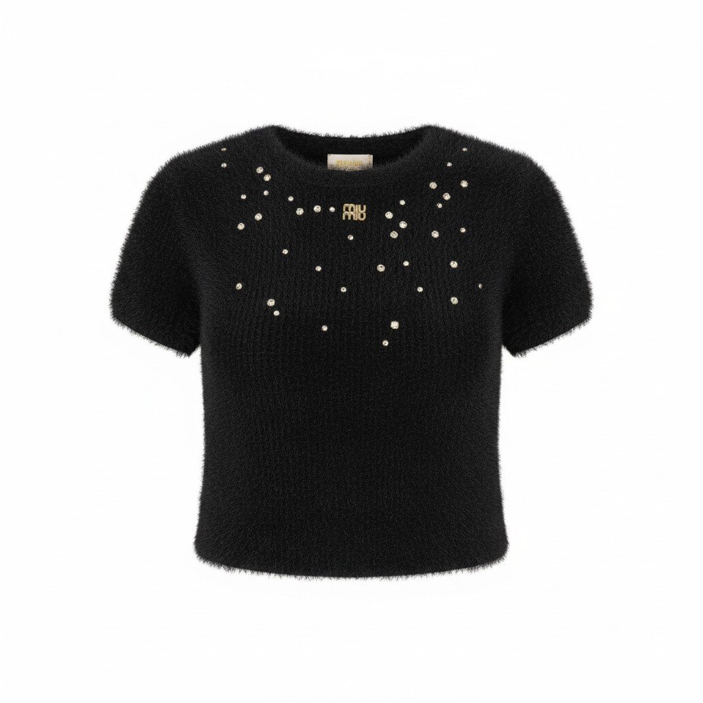 Adoptez l’élégance nocturne avec ce pull court noir en maille poilue ultra-douce. Un design raffiné orné de strass scintillants sur le décolleté et d’un logo doré signature. Parfait pour un look chic et texturé.
