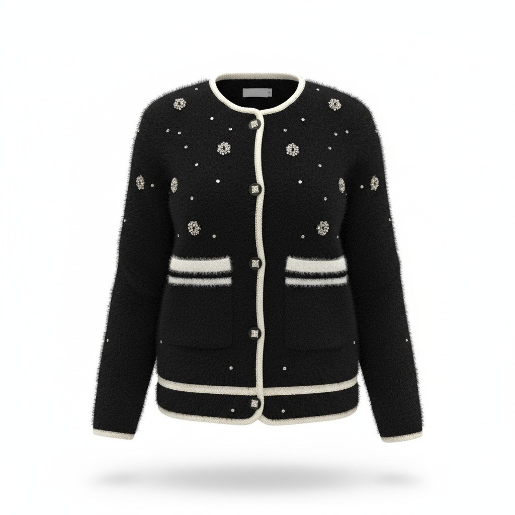 Adoptez l’élégance intemporelle du noir et blanc. Ce pull noir boutonné avec son grand col blanc contrastant et ses boutons bijoux offre un look rétro-moderne irrésistible.