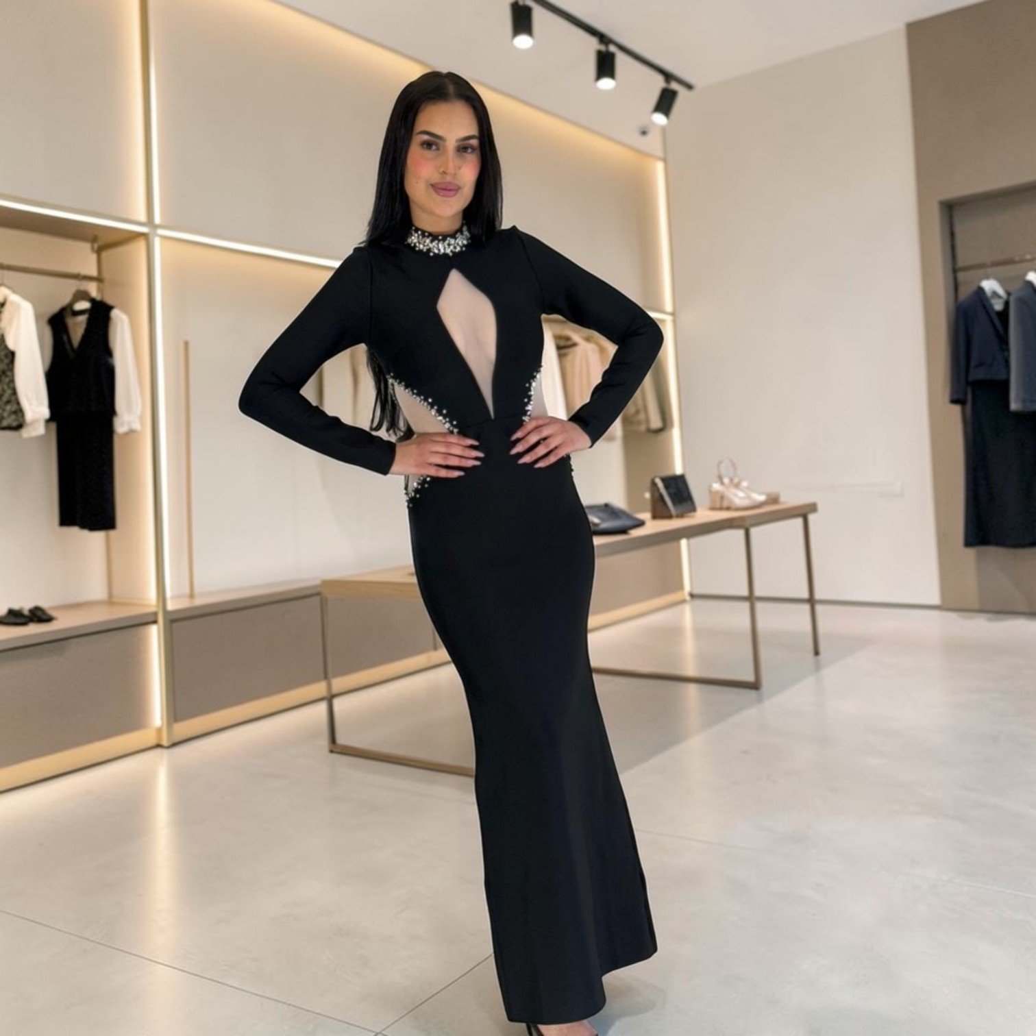 L’élégance absolue. Cette robe longue sirène noire se distingue par son col montant orné de cristaux, ses manches longues et ses empiècements en tulle transparent brodés de strass. Une pièce maîtresse pour vos soirées de gala.